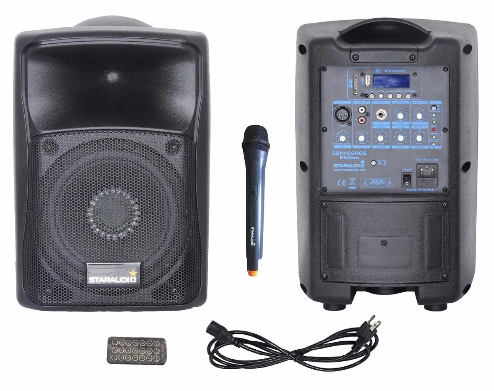 Free Shipping STARAUDIO 800W 8" Stage Karaoke PA DJ BT Powered Active RGB Light Speaker 1CH UHF Wireless Mic SBM-