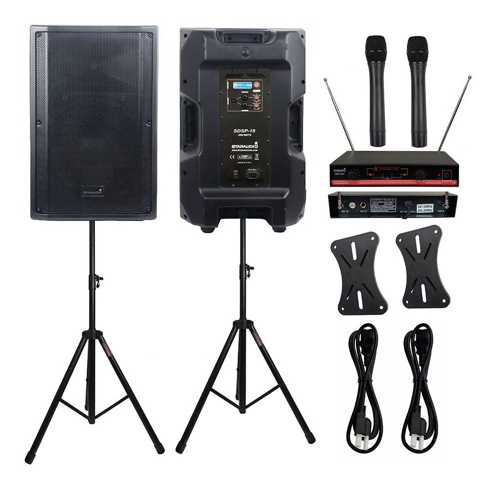 Get STARAUDIO 2Pcs 4500W 15 Inch PA Powered Disco Active DSP DJ Speakers PA KTV Stands 2CH VHF Wireless